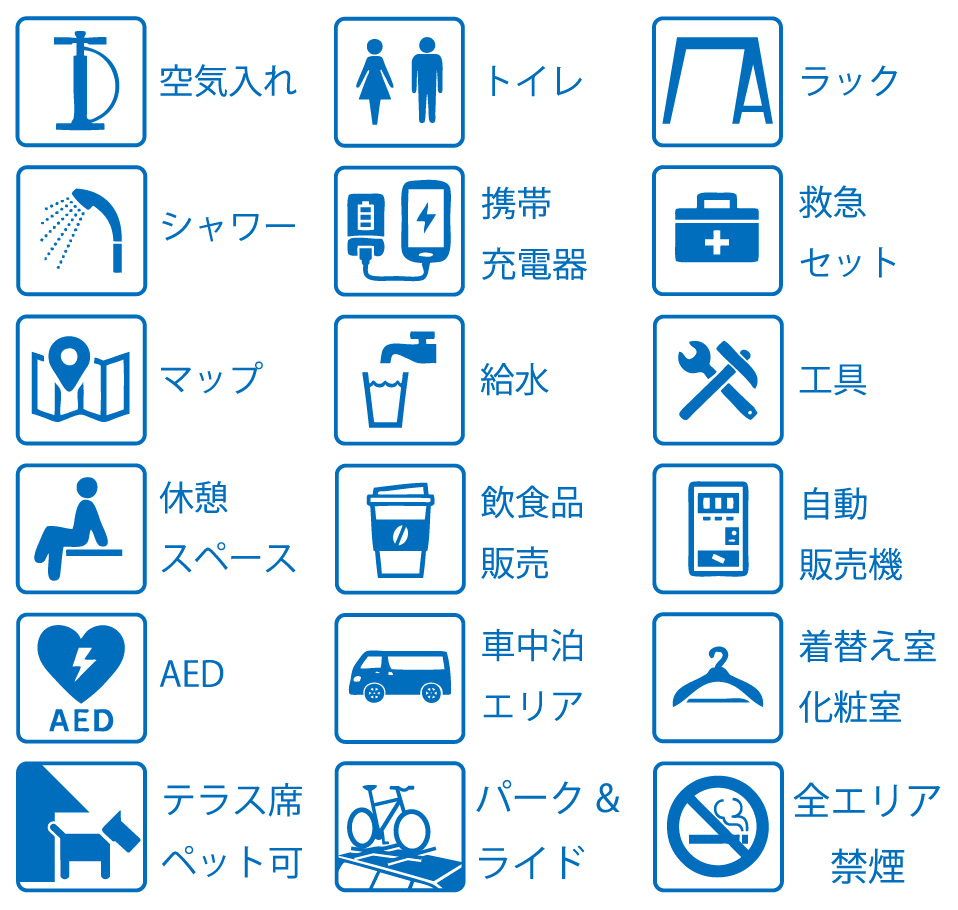 、トイレ・着替え室/化粧室・空気入れ・工具・救急セットをご利用いただけます。
